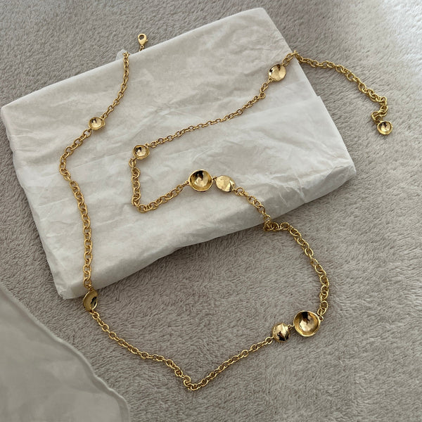 La collana Pianeti è versatile e modulabile. La dimensione della catena infatti consente di indossarla sia lunga che a due giri intorno al collo. La composizione gioca con un mix di catene intervallate da coppette di diversa misura. La collezione Noemi di CACAO Jewels è realizzata con forme morbide e accoglienti, che ricordano le nuvole del cielo e le bolle di sapone.