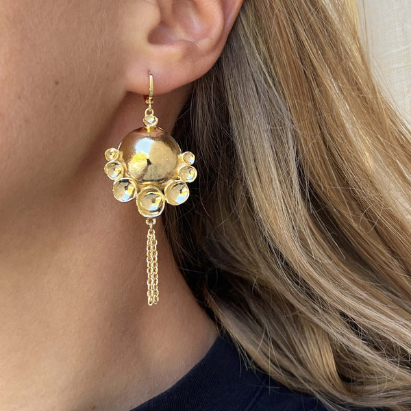Gli orecchini Millebolle sono leggeri e luminosissimi, sono composti da uno disco centrale incorniciato da tante piccole coppette. La collezione Noemi di CACAO Jewels è realizzata con forme morbide e accoglienti, che ricordano le nuvole del cielo e le bolle di sapone.